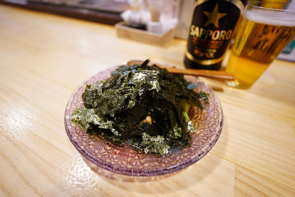 かつてドヤ街だったこのエリアは、いまや安宿を利用するバックパッカーの拠点。海外、ヨーロッパからのお客さんも多く、地中海沿岸からのお客さんもこの店を贔屓にしているのだとか。伝統的な寿司屋の技術と、新しい客層の好みが混ざり合い、こうしたモダンなつまみが生まれているのでしょう。