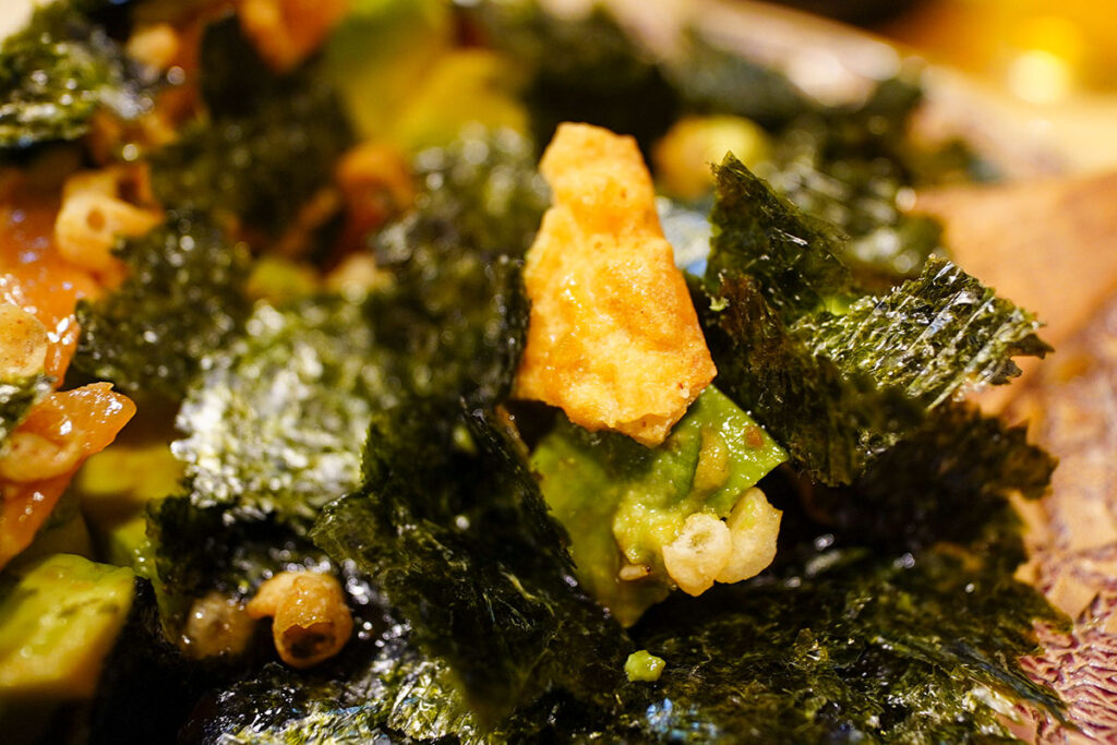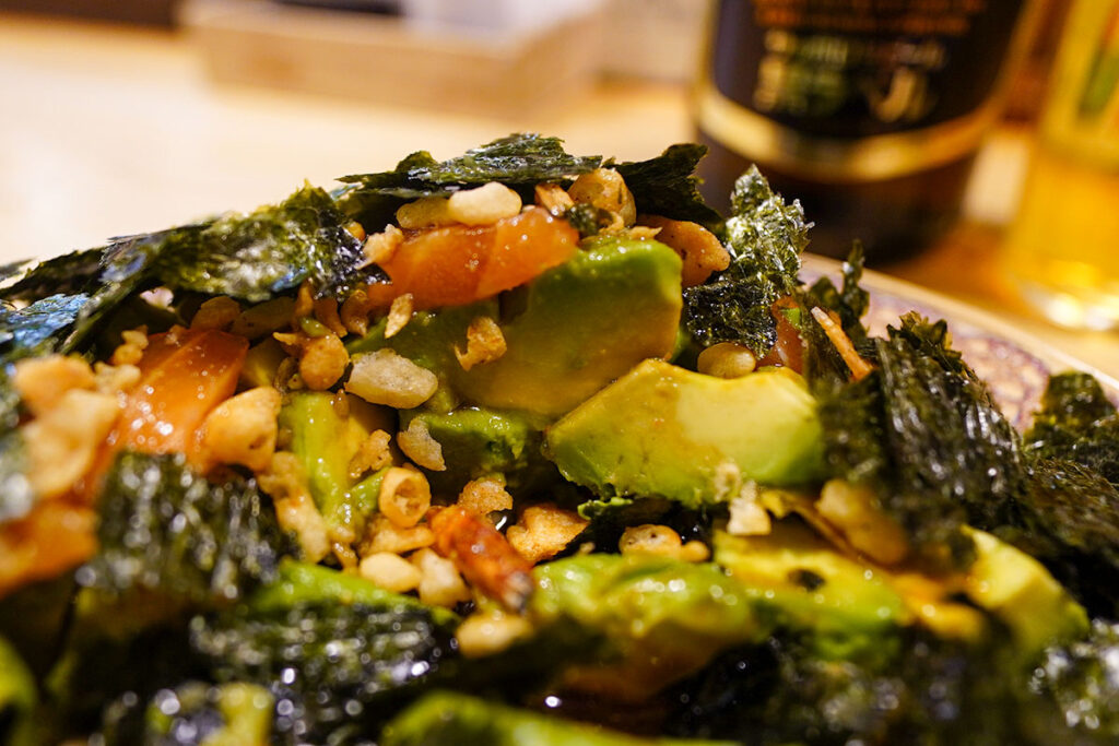 お品書きを眺めていると、老舗の寿司屋らしからぬ「海苔アボカド」の文字が目に留まりました。 気になって注文してみると、これが単なるアボカドではありません。中には脂の乗ったサーモンが隠れていました。