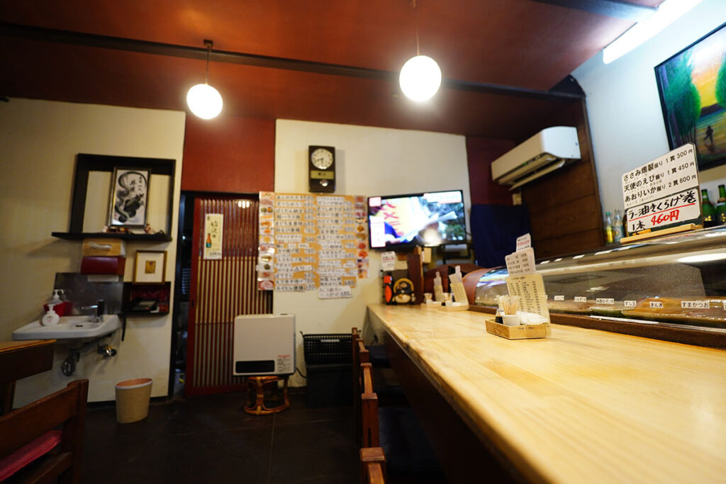 引き戸を開けると、そこには清潔感のあるカウンター。寡黙ながらも几帳面で、丁寧な仕事ぶりが伝わってくるご主人が迎えてくれます。創業から半世紀以上。昭和、平成、令和と、この街の移ろいを見つめてきた老舗ですが、敷居の高さは感じません。むしろ、長い時間をかけて地元に馴染んだお店特有の、温かな空気が流れています。