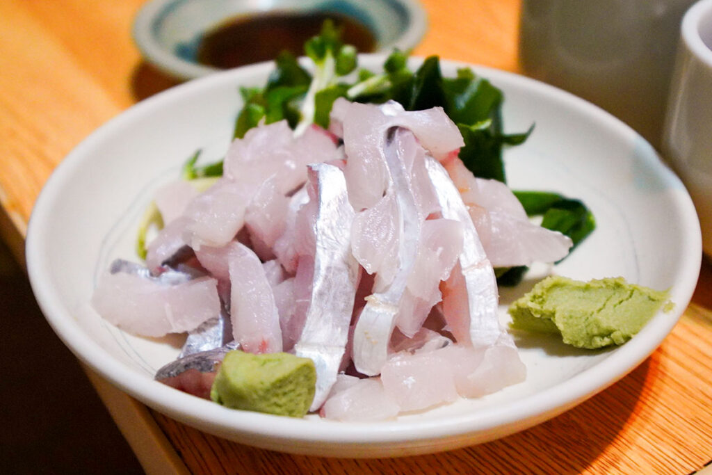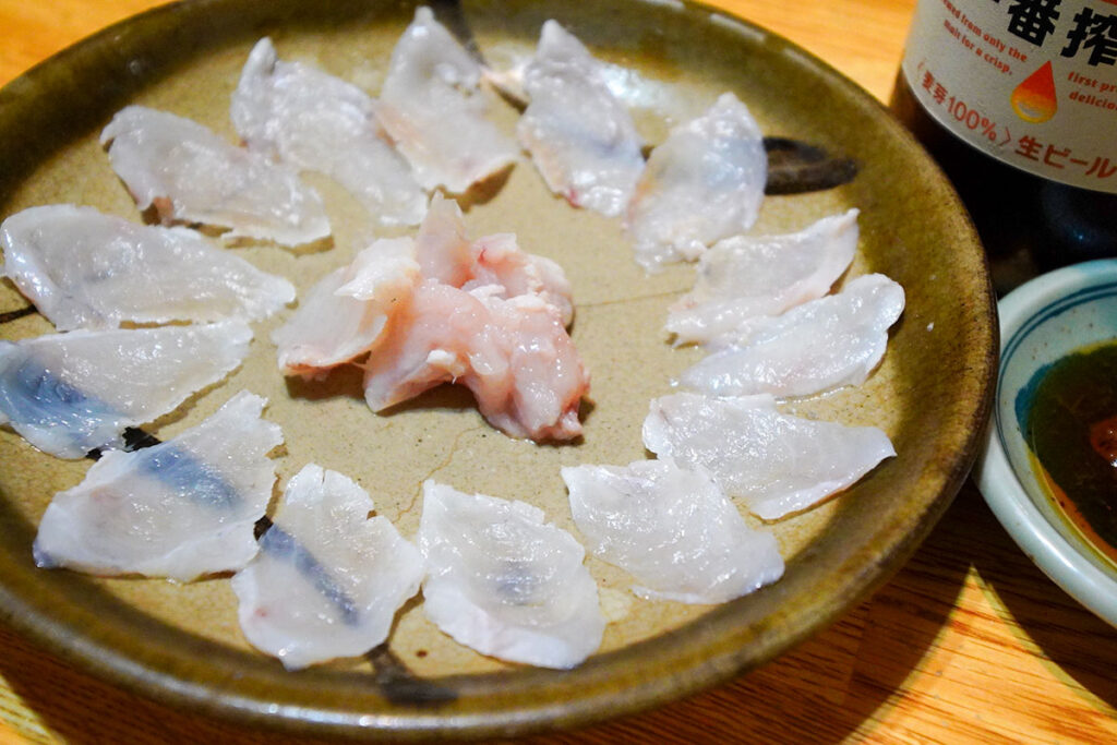 運ばれてきたのは、美しい薄造り。安かろう悪かろうではありません。透き通るような身を数枚まとめて箸で掬い、ポン酢ともみじおろしでいただく。