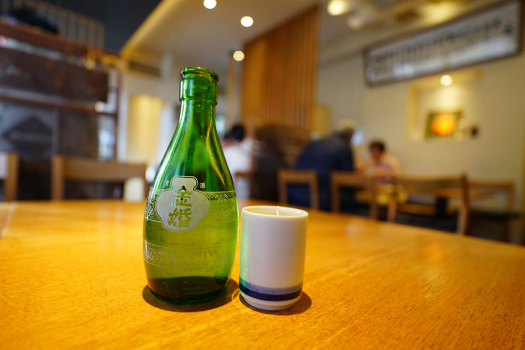 席につき、まずは地酒「金婚」をお願いしました。 下町の老舗蕎麦店でよく見かけるこのお酒、キリッとした飲み口で料理の味を邪魔しません。昔ながらの瓶ごとつけてもらうお燗が嬉しいです。