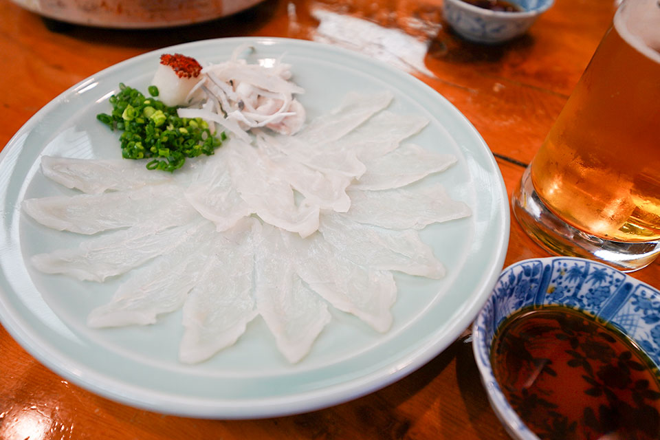 お願いするのは「ふぐちり」(3,800円)。お皿いっぱいに盛られたふぐの身は新鮮でぷりっぷり。これを昆布出汁の鍋にくぐらせて、さっぱりといただきます。