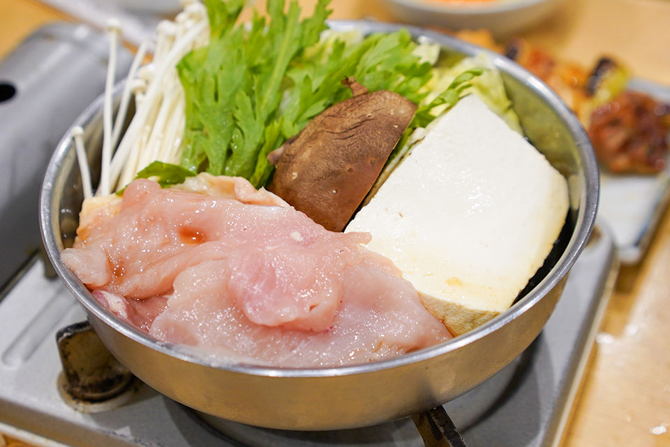 おすすめは「鳥なべ」(1人前・1500円)。鉄鍋の中には、鶏肉、ネギ、春菊、豆腐がぎっしり。すき焼き風の甘辛い割り下で煮込むスタイルです。グツグツ煮えたところを、溶き卵にくぐらせて一口。
