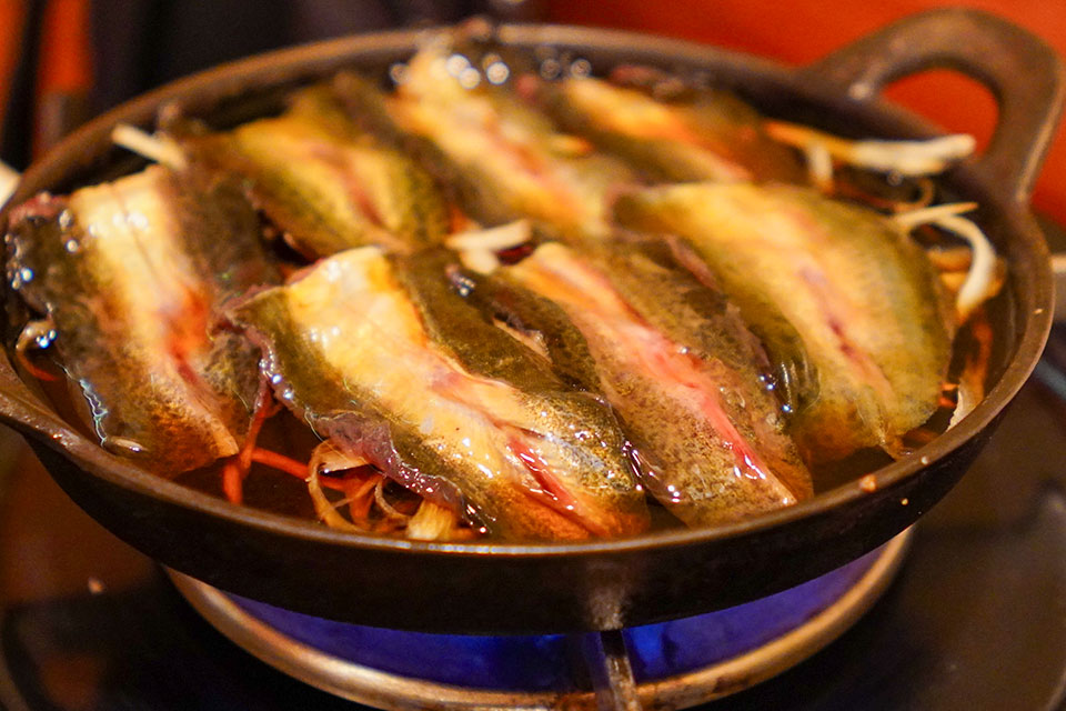 鉄鍋に敷き詰められたドジョウを、たっぷりのゴボウと一緒に割り下で煮込みます。