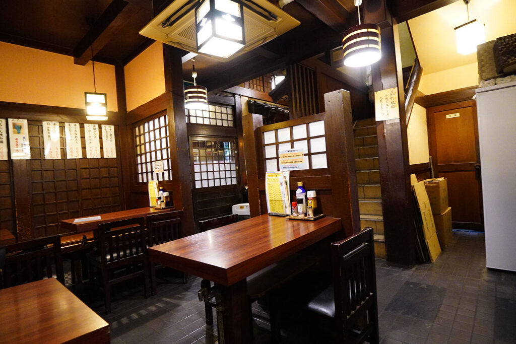 暖簾をくぐると、そこには120席もの広大な空間が広がっています。1階は広々としたカウンター席とテーブル席、2階には宴会もできる座敷があり、一人飲みからグループまで懐深く受け入れてくれます。