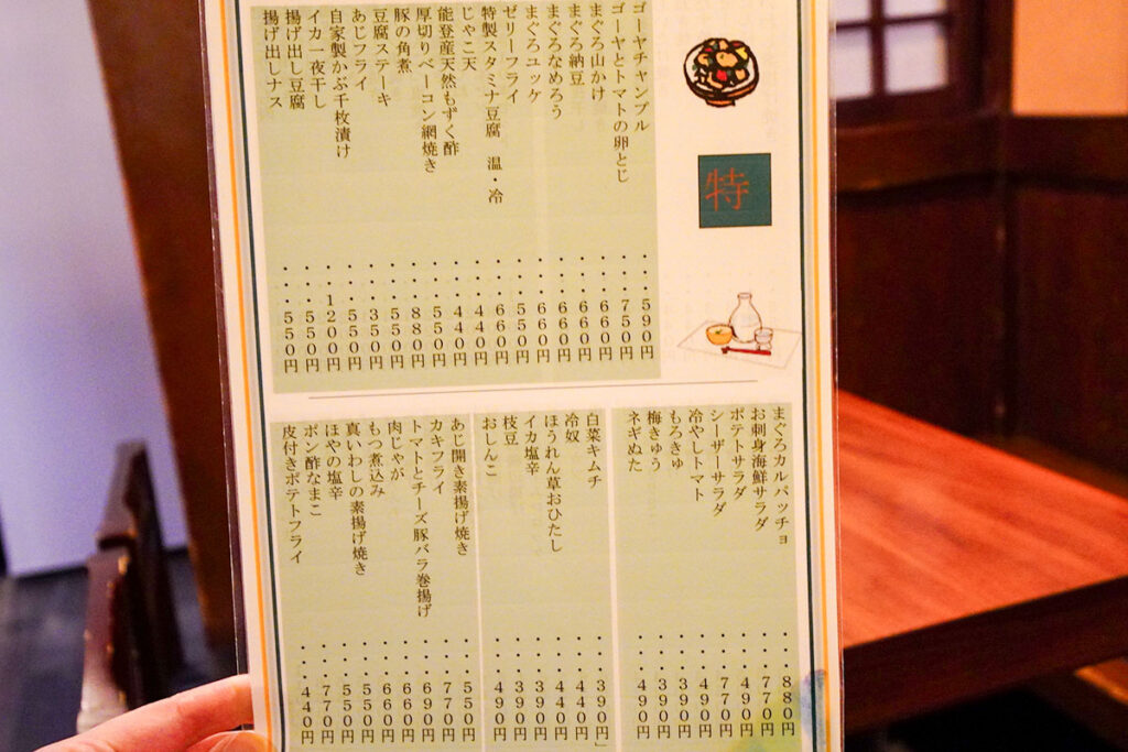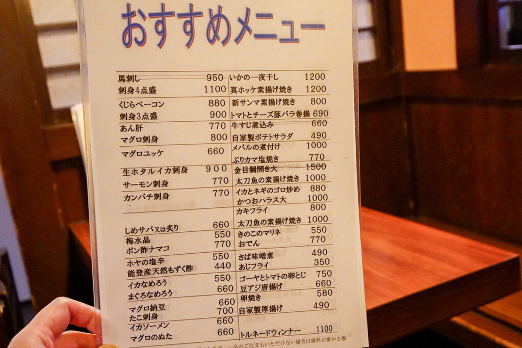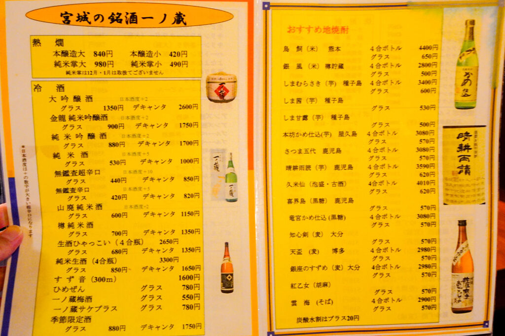 品書きには「一ノ蔵」がずらり。しかも手頃で420円から注文できます。本醸造から大吟醸、季節限定酒まで、常時10種類以上が揃います。縦方向の飲み見比べって、藏のことをより深く知れて楽しいんです。それにしても、これほどまでに一ノ蔵が揃う店は、地元・宮城以外ではそうそうお目にかかれません。