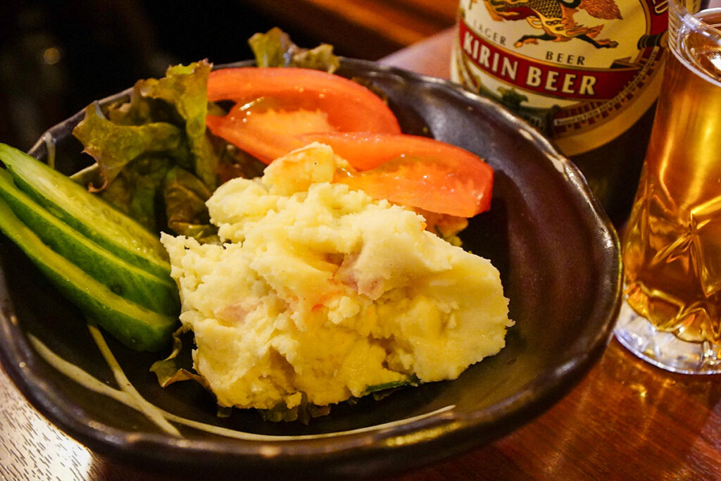 料理も酒飲みのツボを押さえたものが並びます。「自家製ポテトサラダ」(490円)は、マッシュされた滑らかな舌触りで、シンプルながらも味わい深い一品。