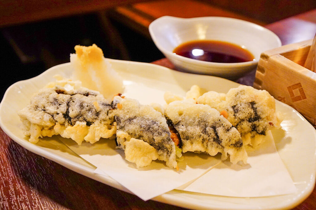 海苔で巻いた納豆をカラリと天ぷらにしたもので、火を通すことで納豆の匂いが穏やかになり、大豆の香ばしさと甘みが引き立ちます。サクッとした衣の食感のあとに、ねっとりとした納豆の旨味。これが驚くほど日本酒に合います。てんつゆが意外と合うんです。