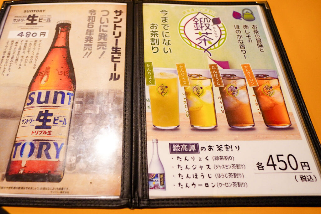 ここで必ず注文したいのが、しそ焼酎「鍛高譚(たんたかたん)」のお茶割り、通称「鍛茶(たんちゃ)」(450円)。 緑茶割り「たんりょく」、ジャスミン茶割り「たんジャス」、ほうじ茶割り「たんほうじ」、ウーロン茶割り「たんウーロン」の4種類があります。