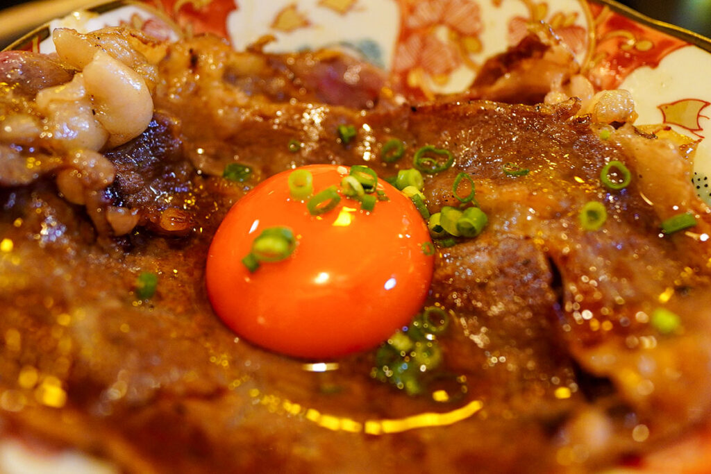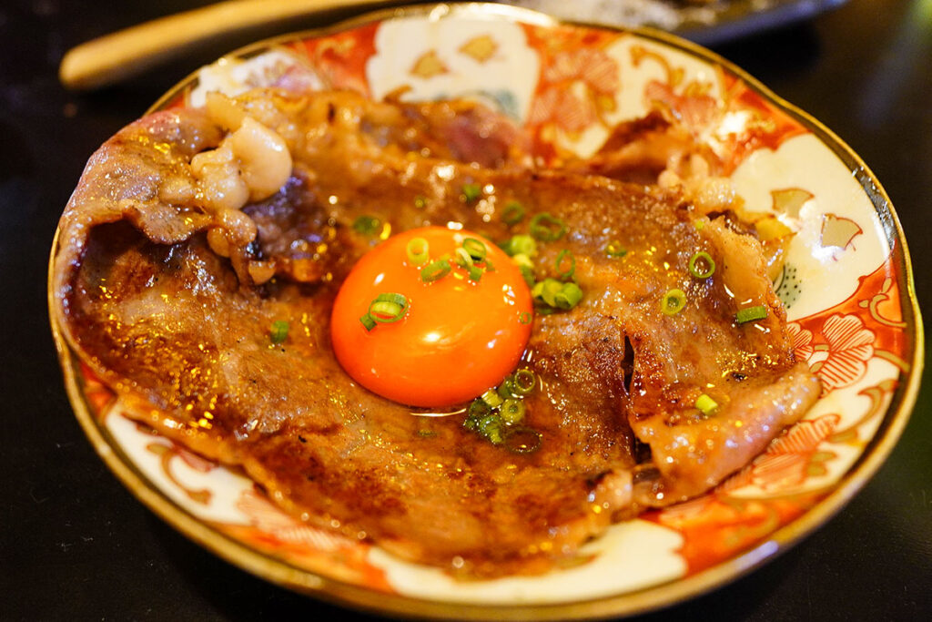 美しくサシの入った薄切りの和牛をサッと鉄板で炙り、こちらも蘭王の卵黄で。