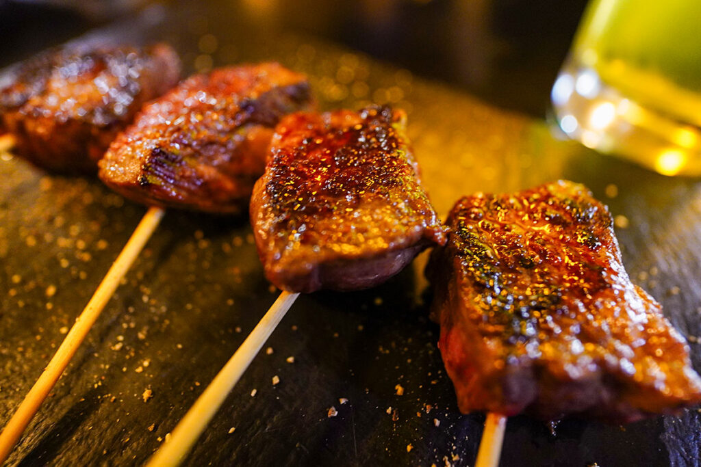 本来は高級な鉄板焼き店で味わうようなステーキを、串打ちして食べやすいポーションにアレンジ。手頃な価格で楽しめるようにしたことで評判になりました。大阪の”串もん”の定番串かつとは違い、衣をつけずに高温の鉄板で焼き上げるためヘルシーなのも魅力です。