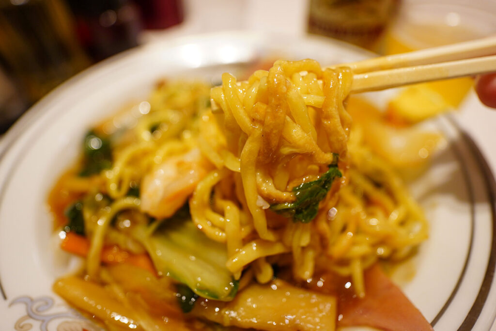 醤油ベースの熱々の餡が、香ばしく焼き付けられた麺によく絡みます。野菜の甘味と海鮮の旨味が溶け込んだ餡は、濃厚ながらも飽きのこない味。