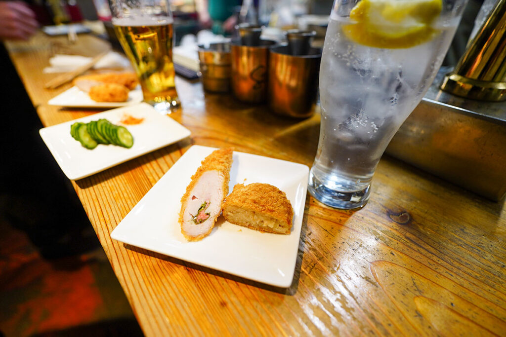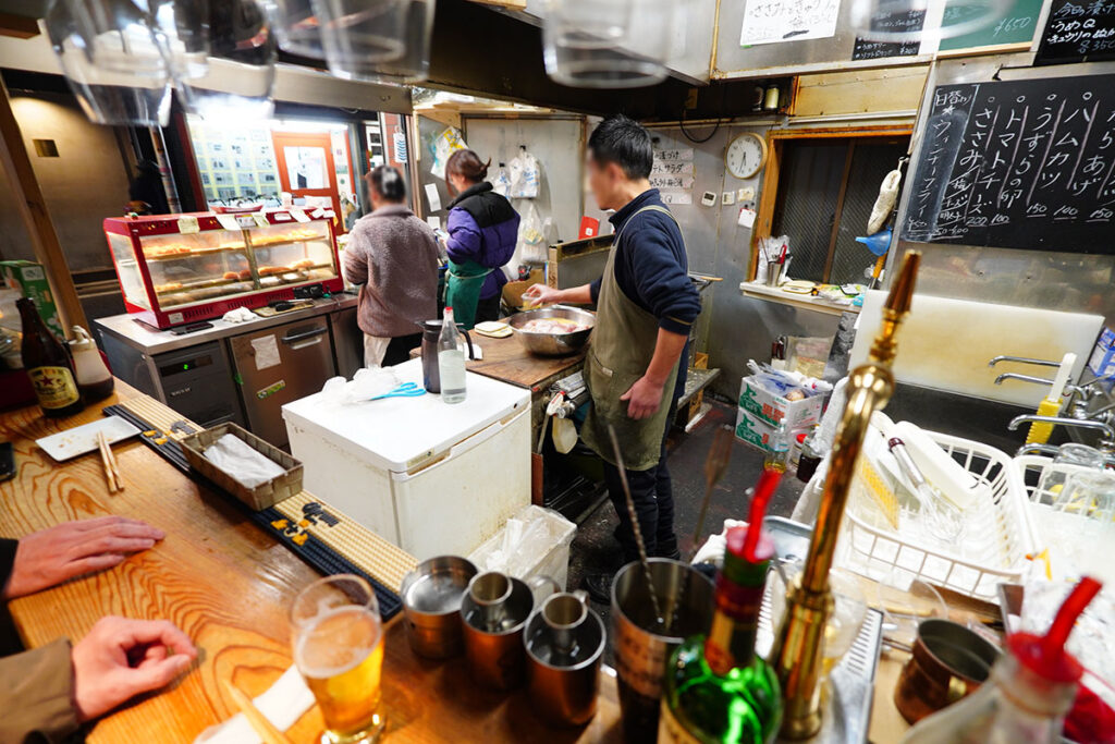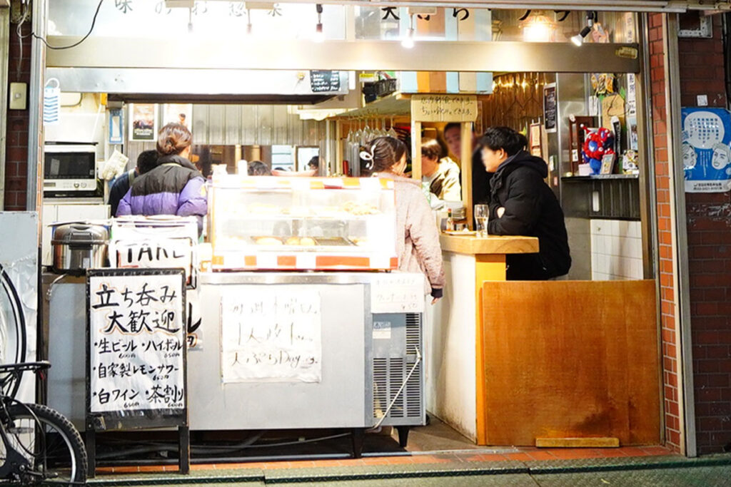 惣菜店としての機能はそのままに、脇に立ち飲み用のカウンターが新設されました。夕飯のおかずを買い求める近隣の人々の横で、揚げたてのフライで酒を飲む。日常と酒場が混ざり合う独特の空間。