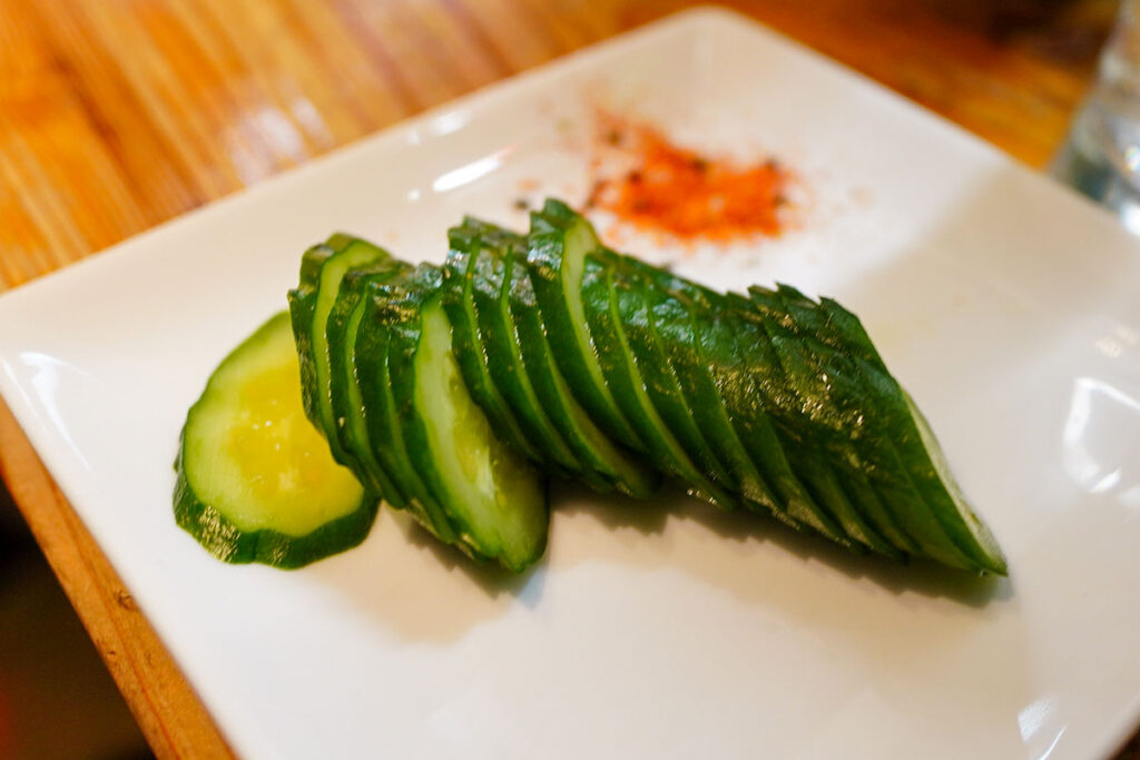 箸休めに選んだきゅうりのぬか漬け(350円)は、しっかりと漬かった古漬けタイプ。酸味が効いており、口の中をさっぱりとさせてくれます。