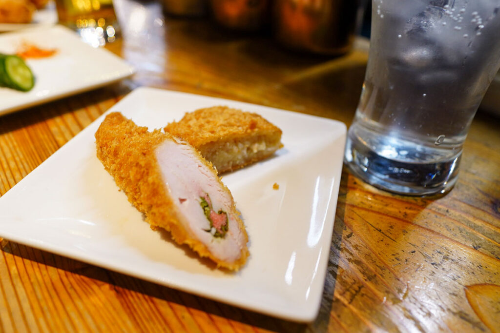 ささみ明太(400円)もお願いしました。二人で訪れたところ、包丁を入れて一皿に半分ずつ盛って提供してくれました。こうした細やかな気配りが酒場での時間を豊かにします。