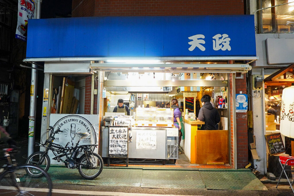 ひときわ目を引く青いテントには「天政」の文字。2023年に閉店した老舗惣菜店の跡地ですが、現在は渋谷で飲食店を展開するチームが『宇田川給水所 ebian』として暖簾を守っています。