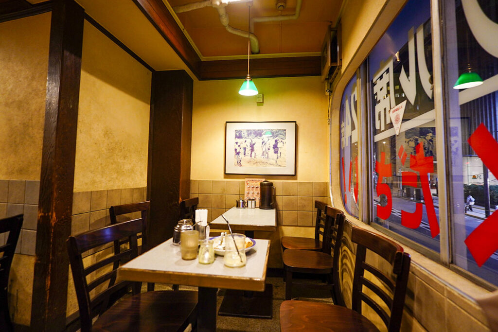 一方、私が夕食がてらの一杯におすすめしたいのは2階です。入り口横の小さな階段を上がると、そこにはテーブル席が並んでおり、窓の外の神保町の夜景を眺めながらゆったりと過ごせます。