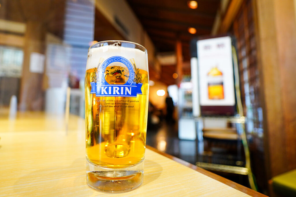 まずは「キリン一番搾り」の樽生で喉を潤しましょう。提供品質が非常に高く、きめ細やかな泡が喉に心地よい。お昼からいただく生ビールは、背徳感も相まって格別の味わい。