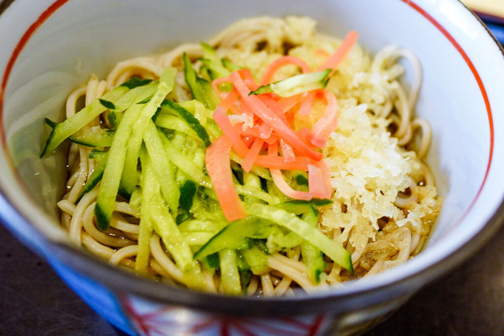 セットの蕎麦は、きゅうりと紅生姜、揚げ玉が添えられた清涼感のある仕上がり。冷やしたぬきそばですね!