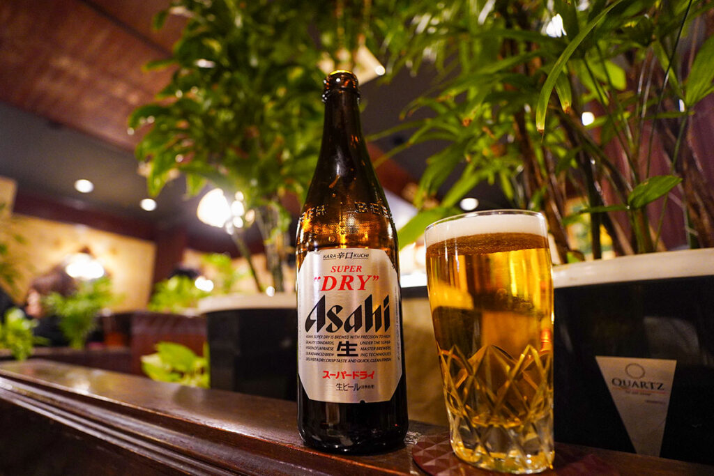 墨田区吾妻橋に本社を構えるアサヒビールの「スーパードライ」。お酒を注文すると、柿の種や豆菓子といった小さなおつまみが付いてきます。