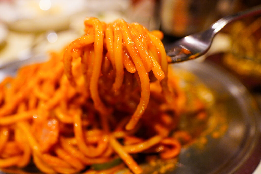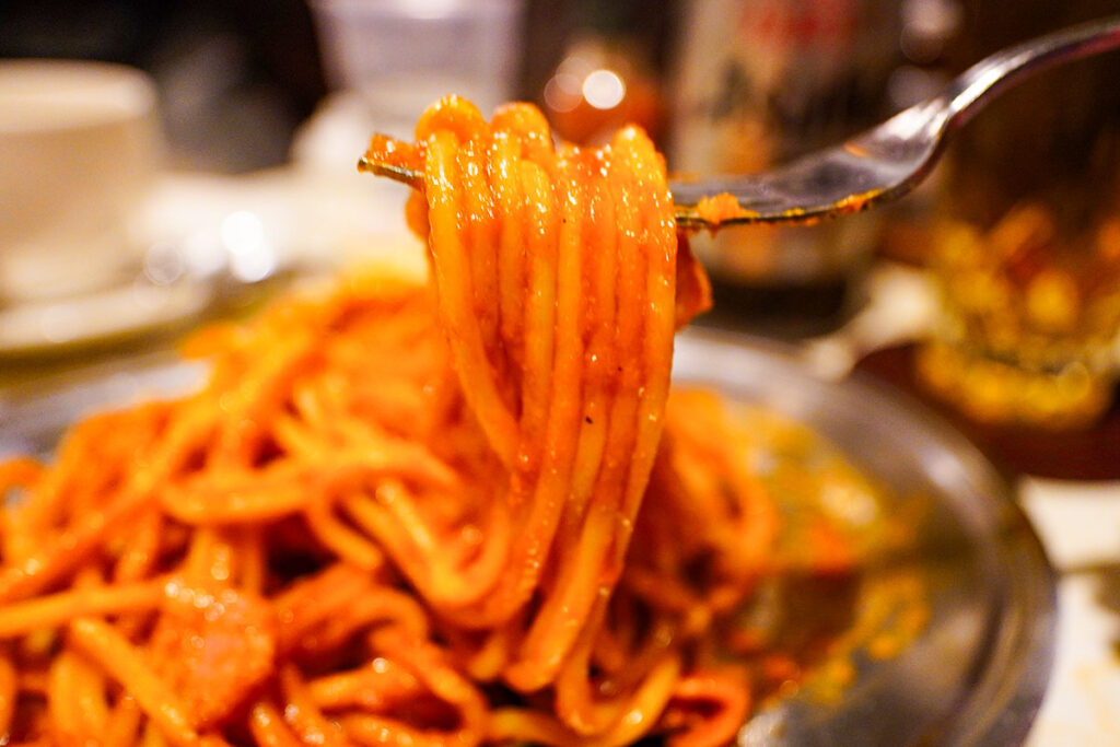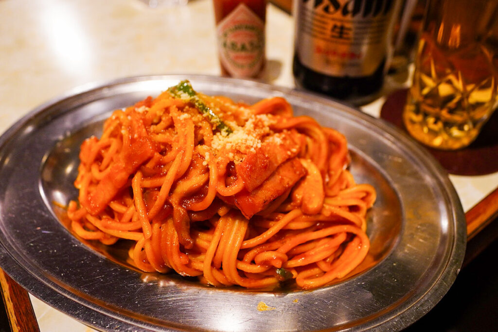 ほどなくして、お待ちかねのナポリタンが運ばれてきました。銀色の皿に盛られた、鮮やかな紅色のスパゲッティ。