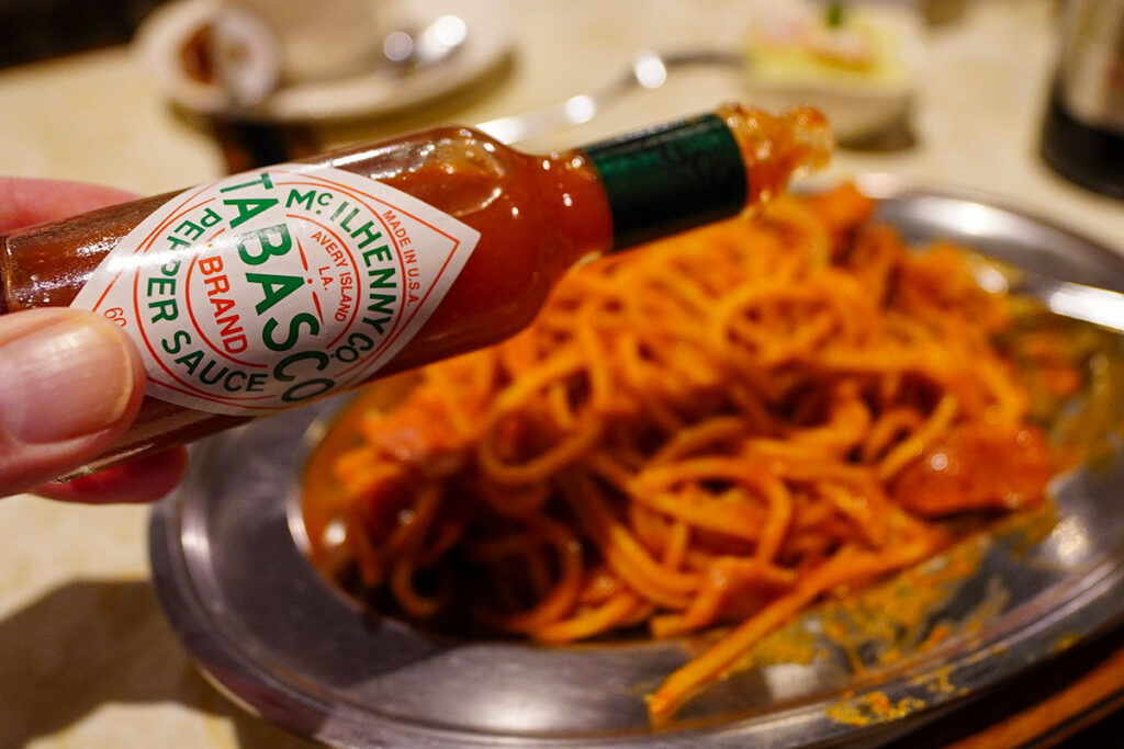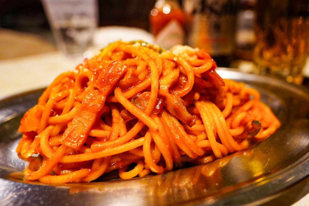 麺は太く、ねっとりとした質感。自家製トマトケチャップソースがたっぷりと絡んでいる。ベーコンの使い方も贅沢。
