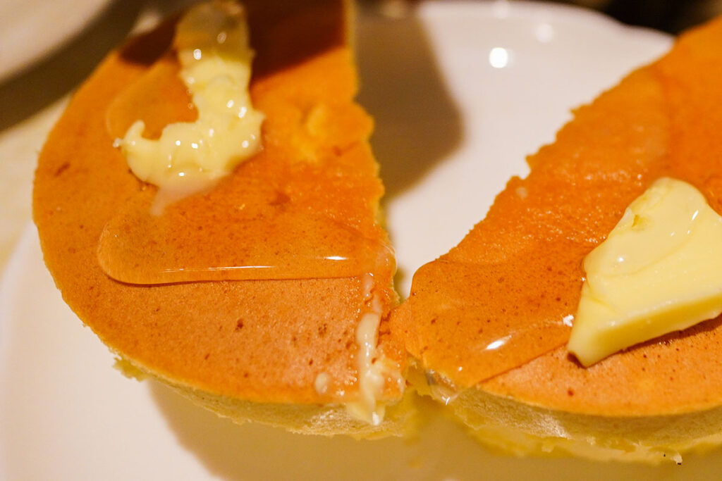 登場したホットケーキは、型で焼かれた正円の美しい形。分厚い生地が2枚重なり、その存在感に圧倒されます。