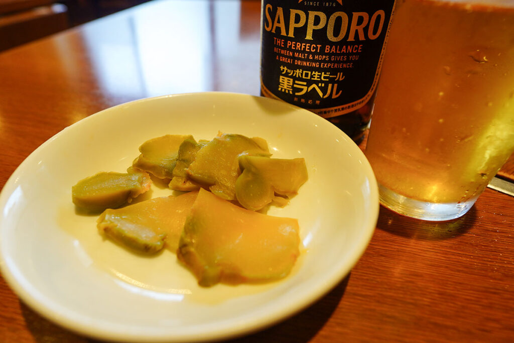 席に着くなり、まずはビール。銘柄は様々ありますが、今回はサッポロ黒ラベルの中瓶を選びました。 お通しの搾菜(ザーサイ)をポリポリとかじりながら、名物が出来上がるのを待ちます。