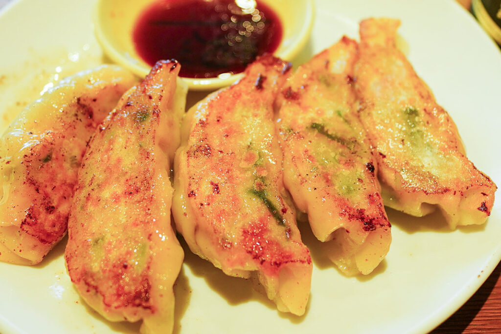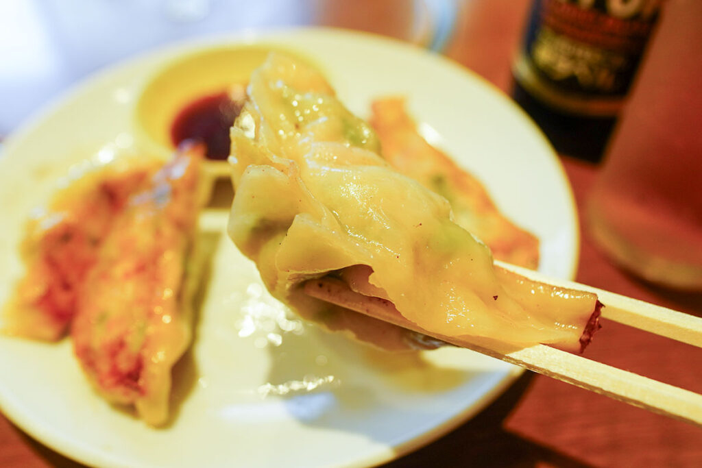 今回の目当ては、名物の焼き餃子(600円)。 一般的な三日月型とは少し異なり、ごろりとした丸みを帯びた形状が特徴です。箸で持ち上げると、見た目以上にずっしりと重さを感じます。