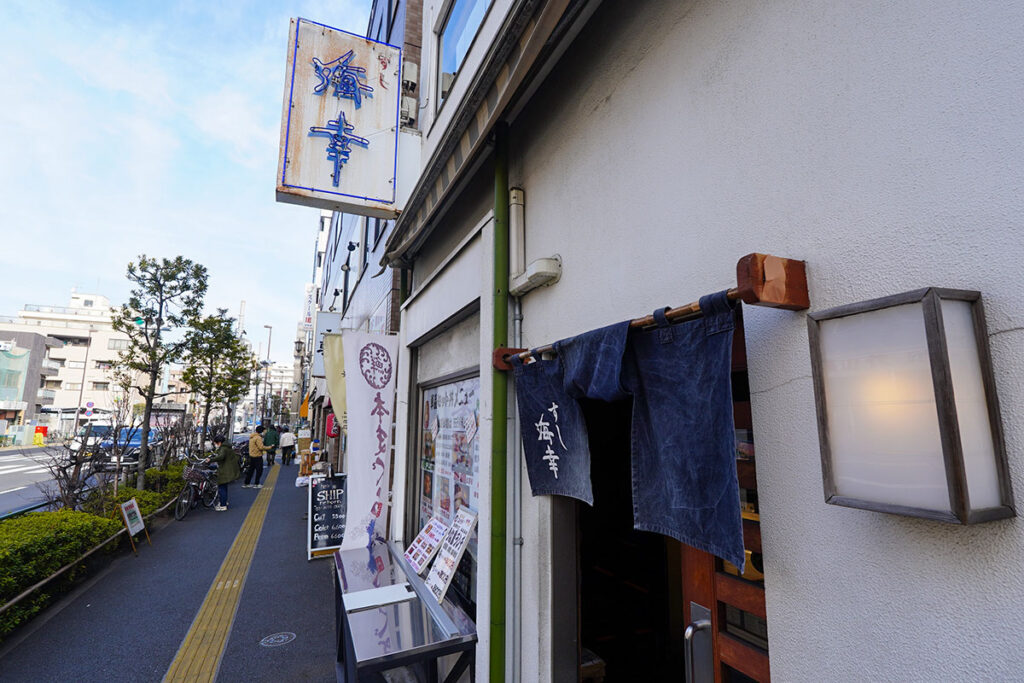 錦糸町駅から都営バスに乗り込み、「北砂二丁目」で下車。バス停から明治通り沿いにほんの数歩あるけば、目的の『鮨処 海幸(かいこう)』が見えてきます。 有名な「砂町銀座商店街」の入り口に位置し、いつも行列が絶えない人気店です。