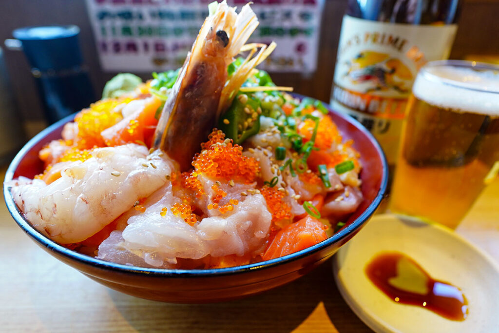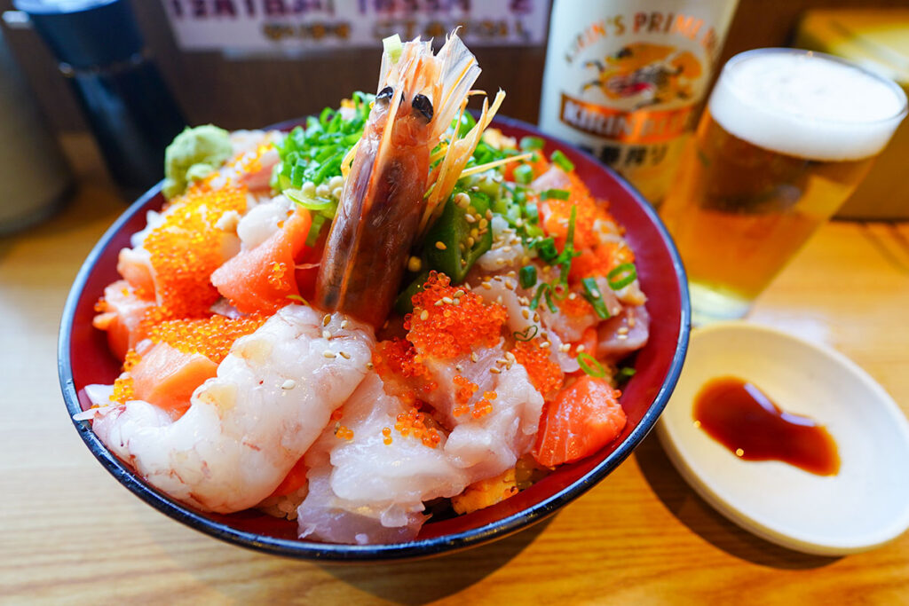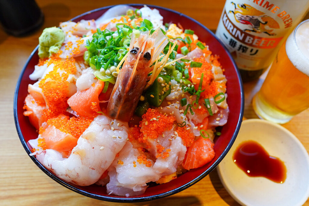 これは「ばらちらし」というより、もはや「海鮮の盛り合わせ」をご飯の上に乗せた料理と言ったほうがしっくりきます。 賽の目に切られた刺身をひとつまみ、そこへビールをくいっと。多彩な食感と旨味が口の中で混ざり合い、至福の時間が流れます。