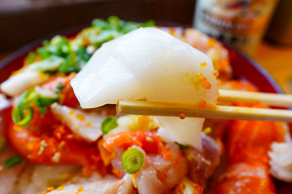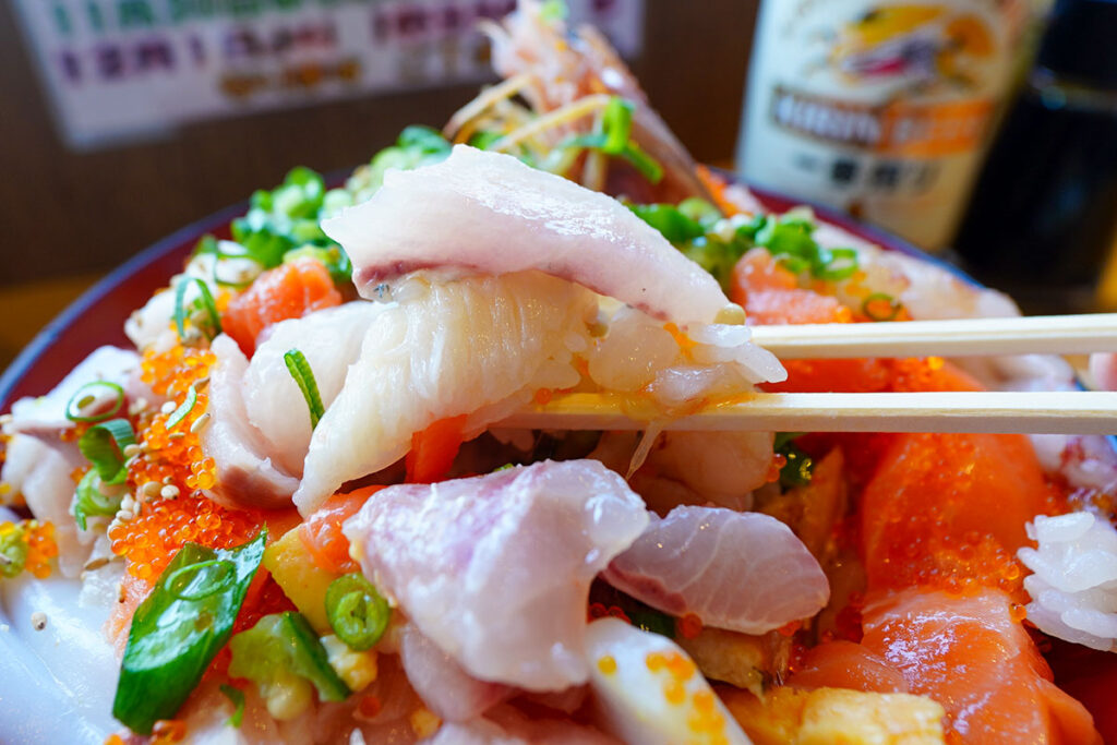10種類近くの具材が、これでもかと言わんばかりにひしめき合っています。母体が鮮魚店だけあり、その鮮度は折り紙付き。