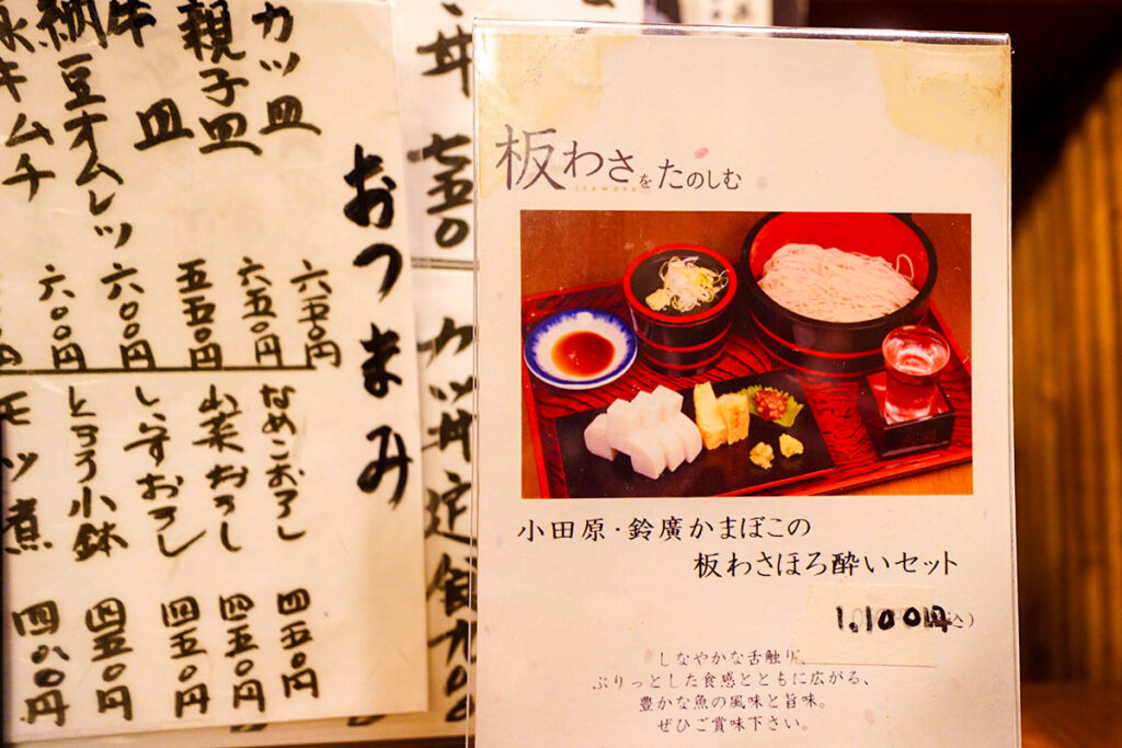 お酒の種類も豊富で、小田原「鈴廣」の板わさがついた「ほろ酔いセット」なんていう、お酒好き・蕎麦前好きには嬉しい気の利いたメニューも用意されています。