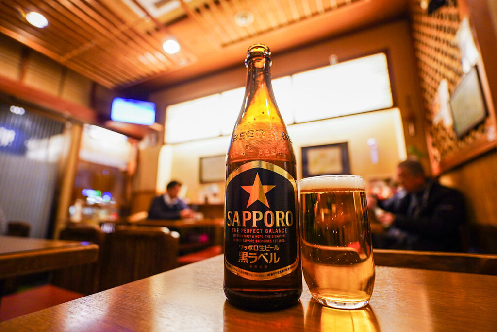 合わせるお酒は、サッポロ黒ラベルの中瓶から。いつもの北極星(サッポロの星)も、老舗ではさらに輝いて見えます。