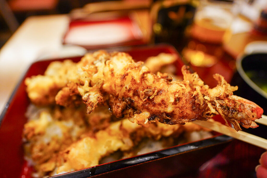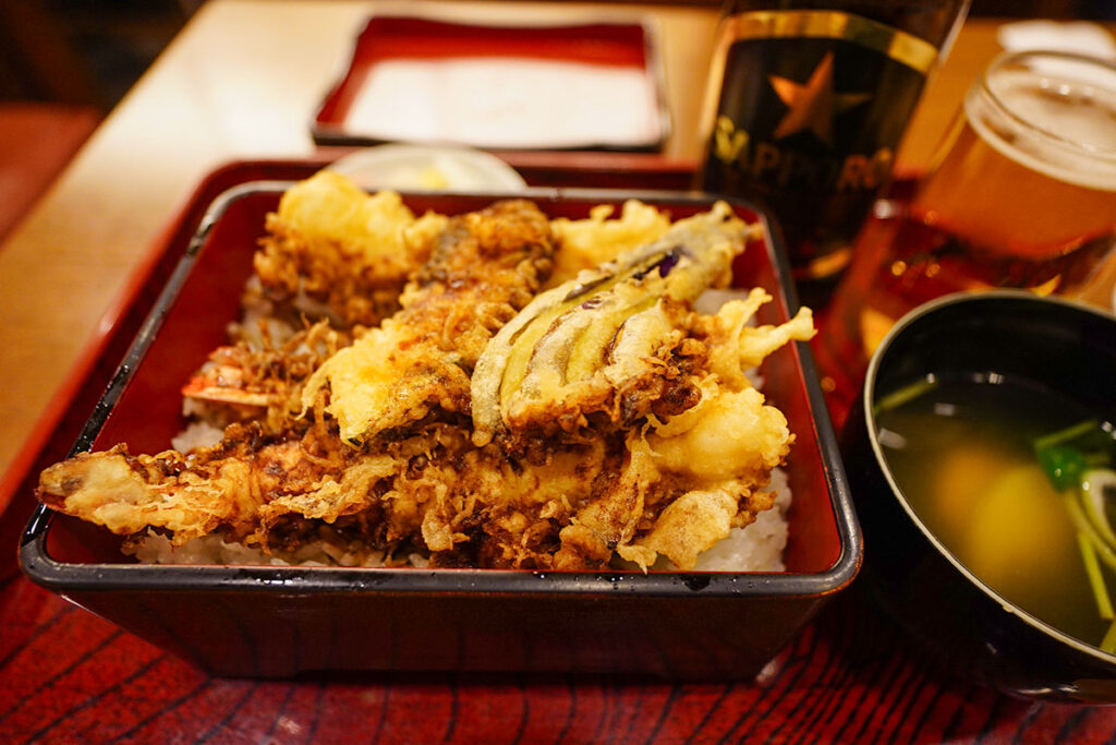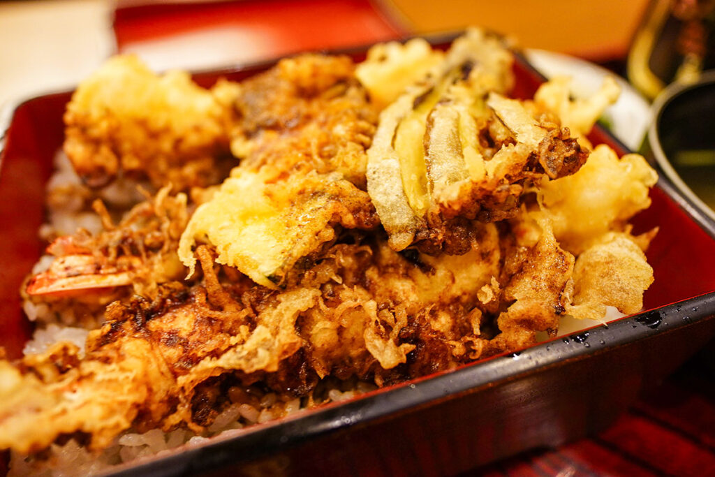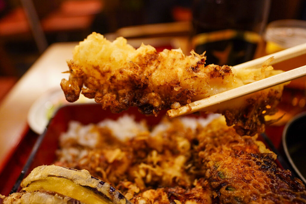 天ぷらを載せる前にタレをご飯にも染み込ませているので、ご飯もこげ茶色。全体的に醤油辛そうに見えるかもしれませんが、食べてみるとそれほど塩味は強くなく、江戸東京らしい絶妙な塩梅です。