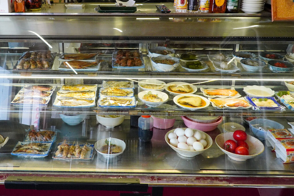 ガラスケースには、今日のおすすめの刺身や焼き魚、煮魚、小鉢が並んでいます。席に着く前に、ここで実物を見て注文を決めるのが徳市の楽しみ方。常連さんたちは慣れた手付きでおかずを選び、定食にして頬張っていました。