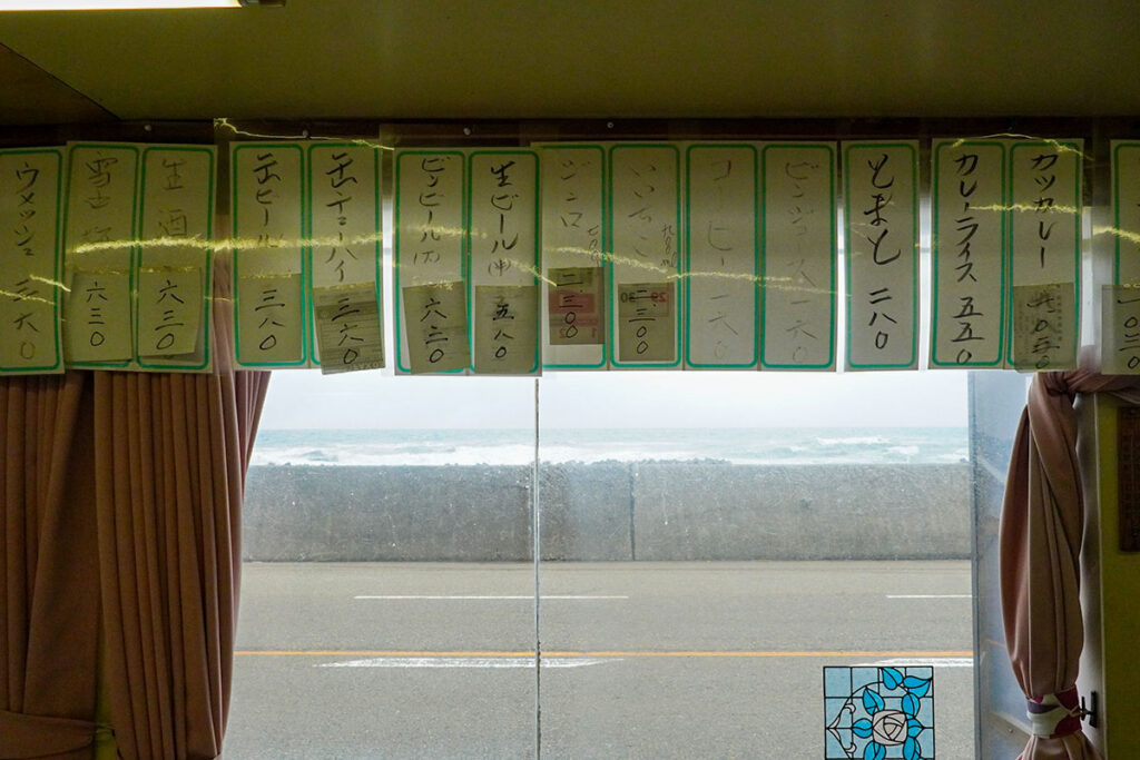 窓の外はすぐ海。ガラスがガタガタと鳴るほどの強風の日もありますが、店内の暖房の暖かさと、テレビの音が妙に心地よく感じられます。いまにも物語が始まりそうなシチュエーションにワクワクが止まりません。