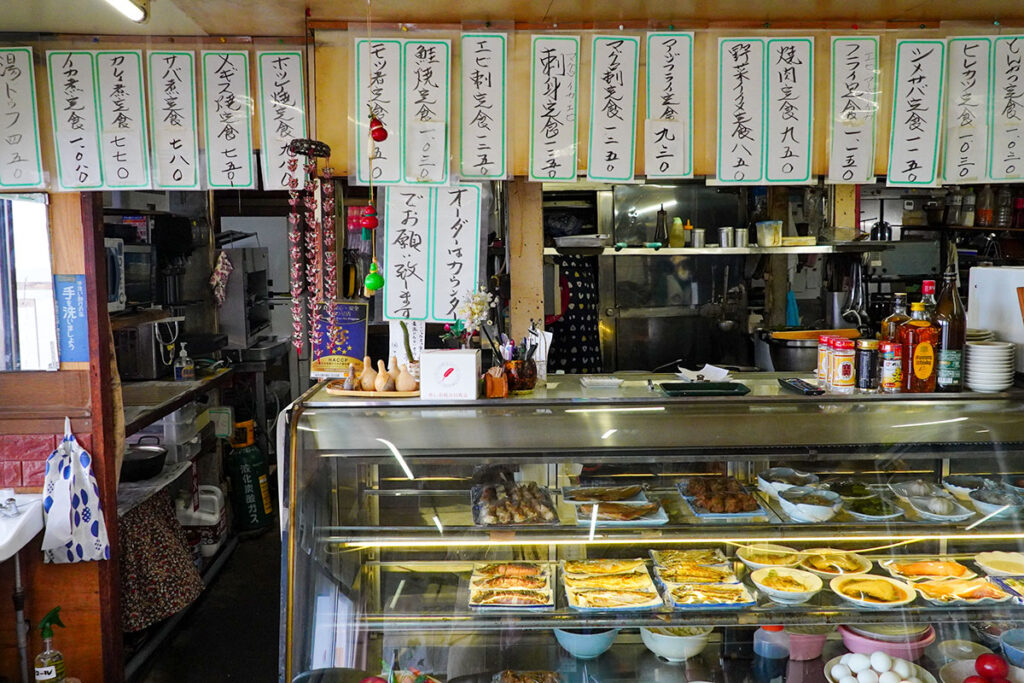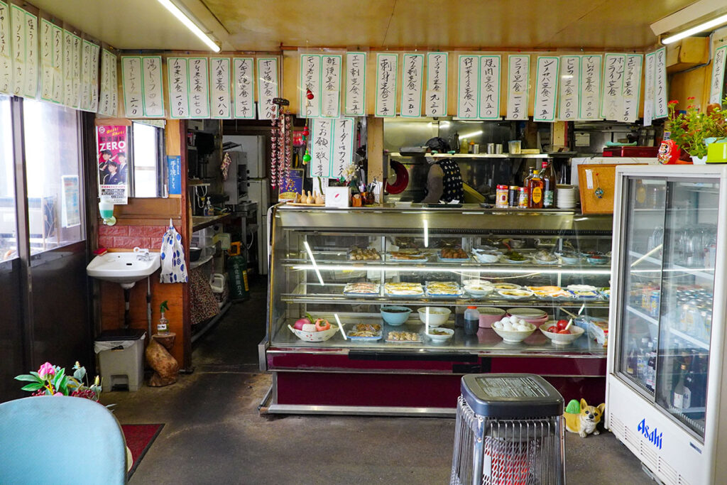 建物は平屋で、隣には釣具店が併設されています。というより、釣具店と食堂が一体化したような不思議な造り。かつては24時間営業で、深夜に国道を行き交う長距離ドライバーのオアシスだった場所です。現在は朝8時から営業。アルコールの提供もあるので、ドライバー以外は朝酒を楽しむこともできます。