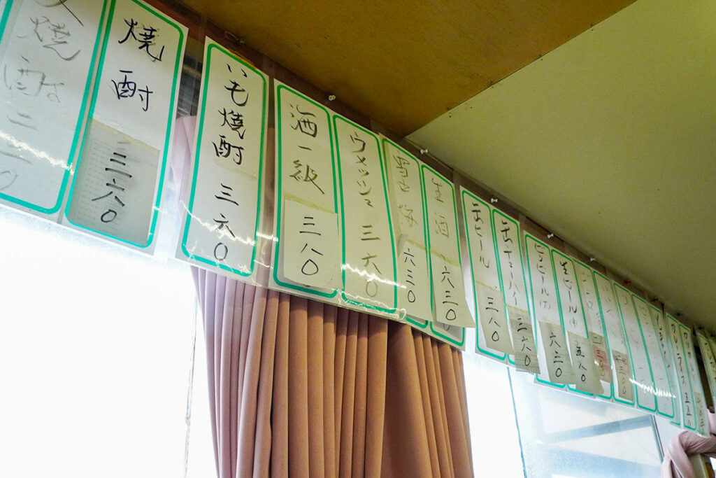 パイプ椅子にテーブル席、小上がり。壁一面には手書きの短冊メニューがびっしりと貼られています。