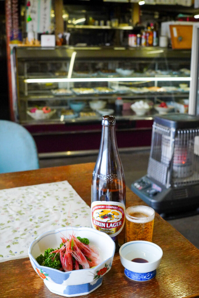今日の目当ては、日本海の冬の幸です。壁のメニューには名物のアジフライやイカ天も並びますが、今日は刺身で飲みたい。このあたりで水揚げされる「甘エビ」を注文しました。