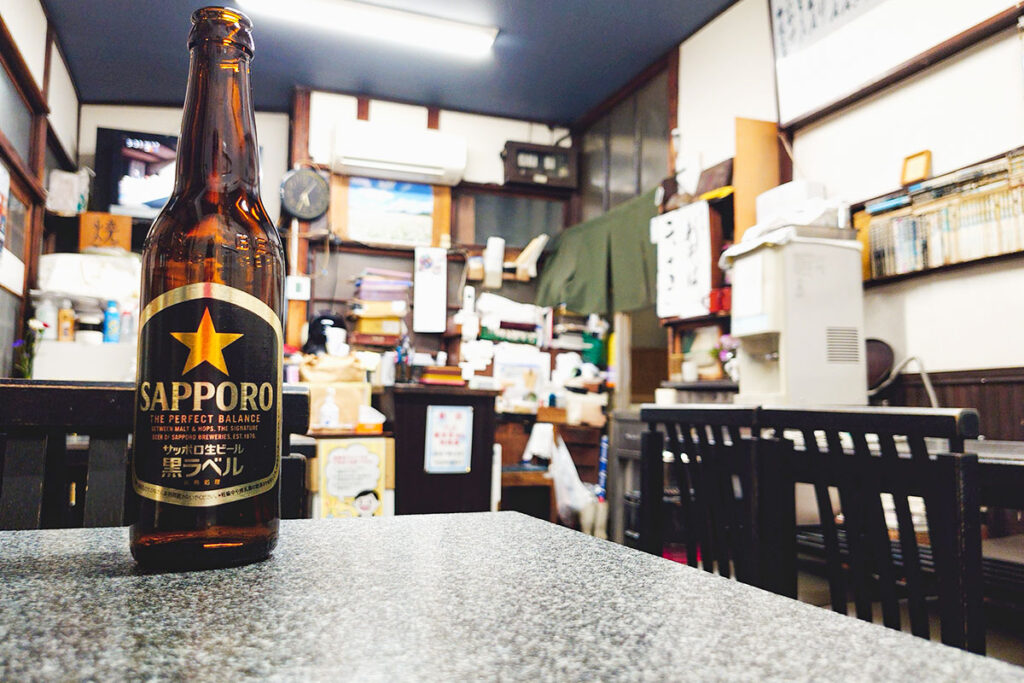 席に着き、まずは心を落ち着けてお酒を選びます。中目黒駅からはひたすら上り坂だったので喉が渇きました。まずはサッポロ黒ラベルの小瓶で乾杯!