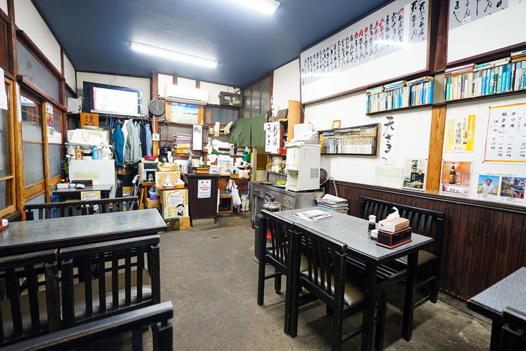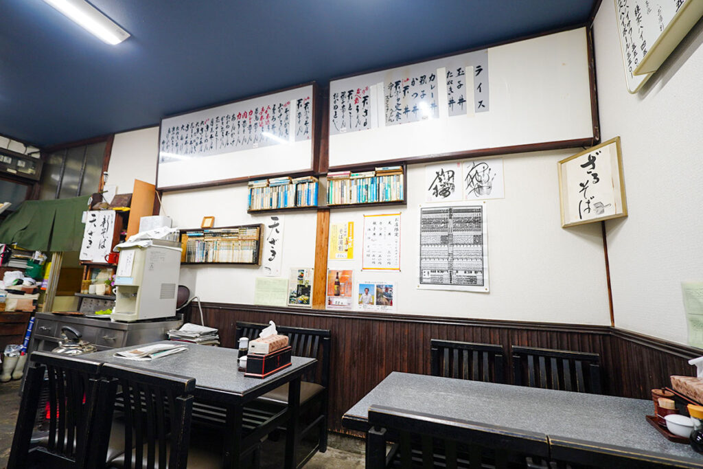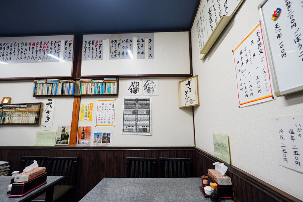 マンガや新聞が無造作に置かれているのも、街場の蕎麦屋らしくて落ち着きます。観光客向けに飾られたレトロではなく、長年使い続けられてきたからこそ滲み出る本物の風格です。