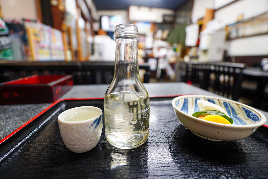 選んだのは千葉県の銘酒「東薫(とうくん)」(600円)。大衆的な蕎麦屋で、千葉の佐原にある酒蔵のお酒を置いているのは少し珍しいかもしれません。冷や(常温)でお願いすると、ガラスの徳利で供されました。