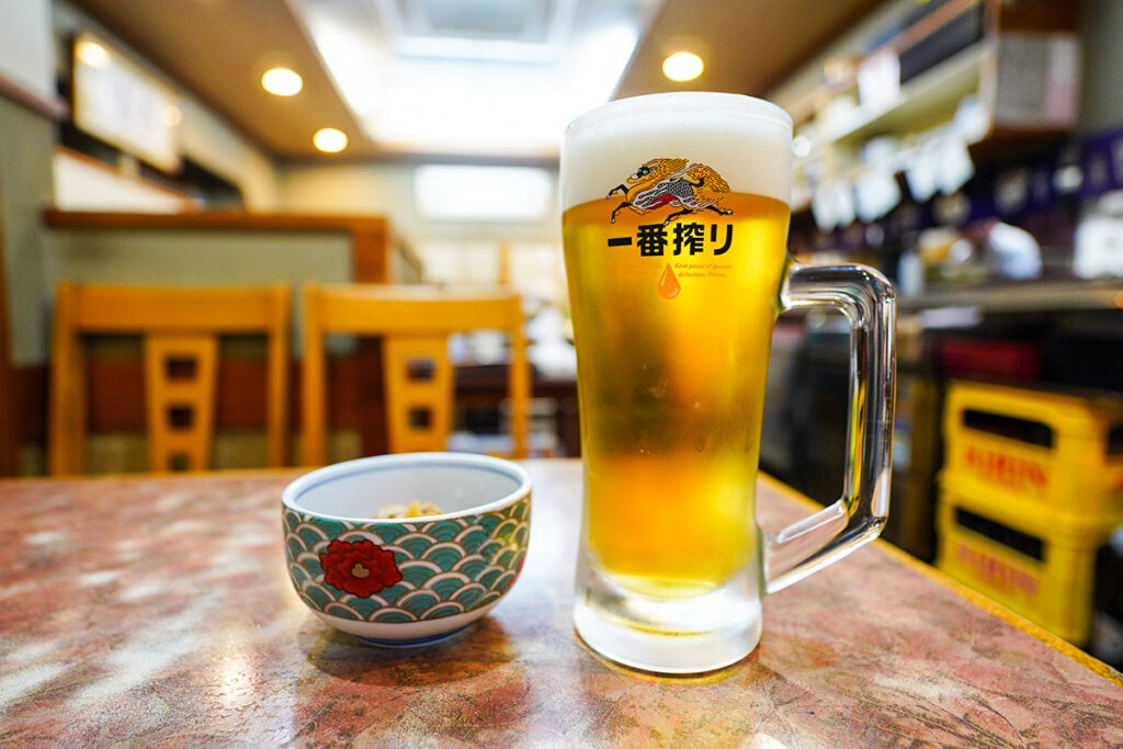 さあ、まずは生ビールをもらいましょう。手入れが行き届いたピカピカのサーバーから注がれる「キリン一番搾り」。きめ細やかな泡が蓋をした美しい一杯です。生ビールは、お店の”気合い”バロメーターのひとつだと思っています。