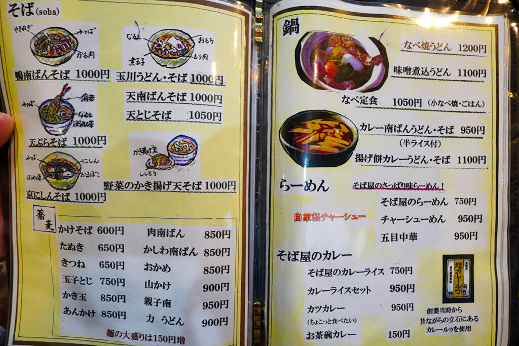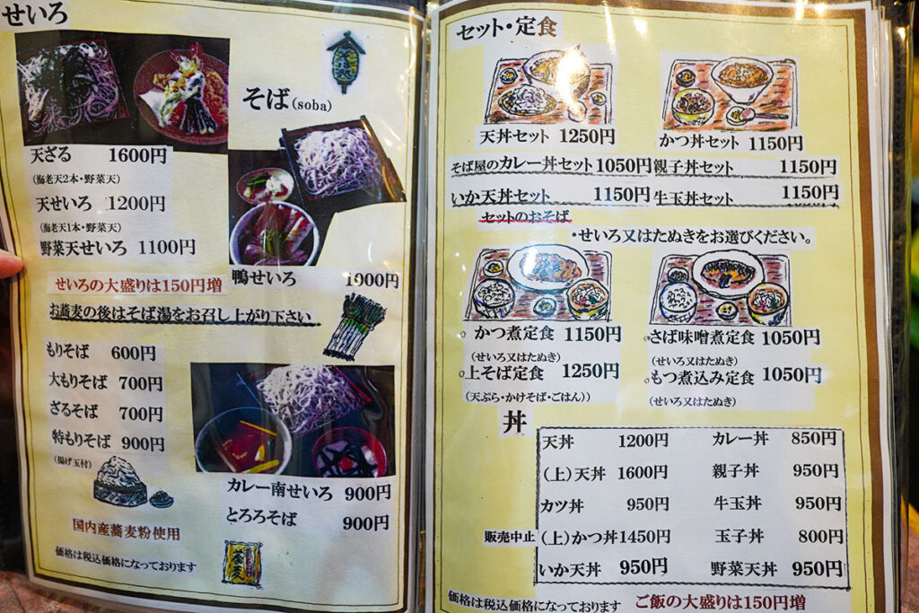 品書きを開けば、そこには町蕎麦らしい安心感のあるラインナップ。「天丼セット」や「カツ丼セット」など、ボリューム満点のセットもある。町の大衆店ですもんね!