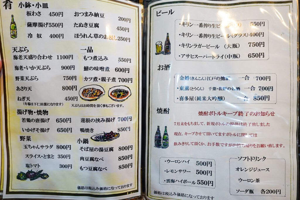 それだけでなく、酒の肴になりそうな一品料理も充実。「板わさ」や「もつ煮込み」といった定番に加え、季節ごとの天ぷらもある様子。昼酒を楽しむのにも申し分ない環境です。