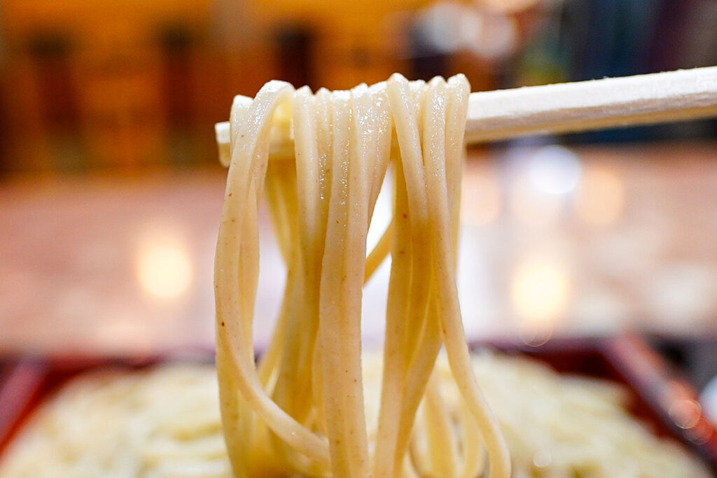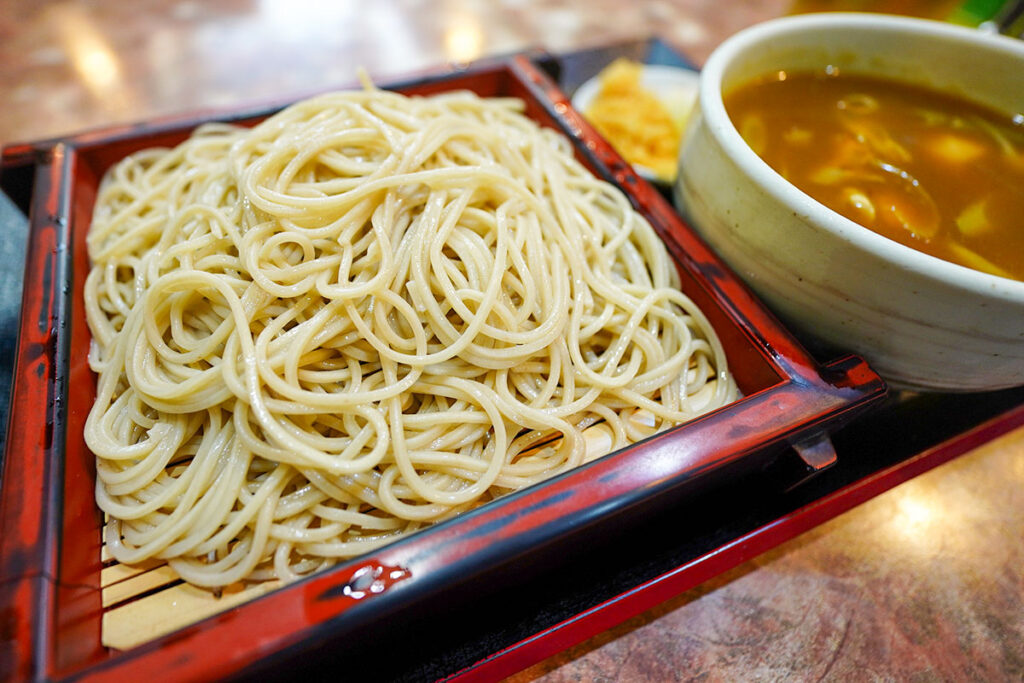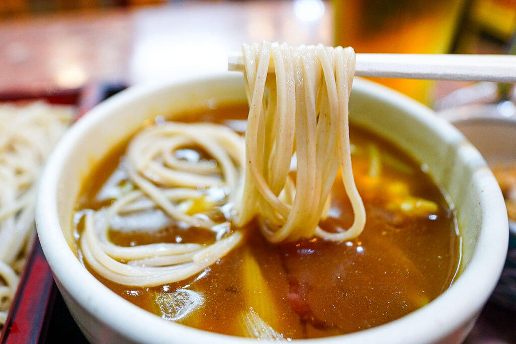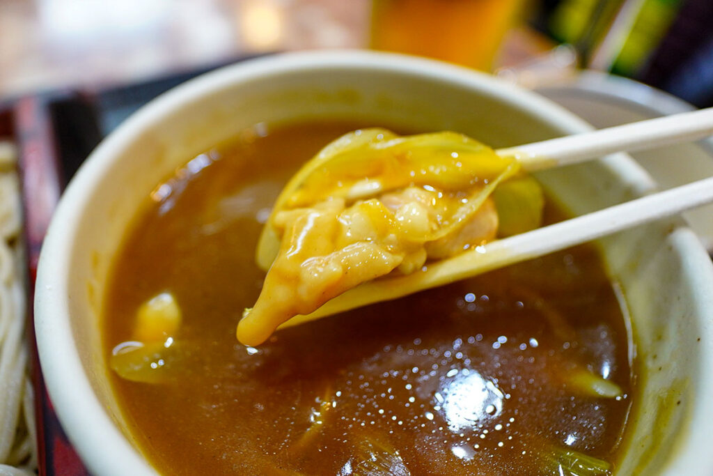 片栗粉がしっかりと効いており、とろみが強い。老舗の蕎麦屋は「熱いものは熱いうちに」を信条としますが、ここのカレー汁も相当な熱さです。冷たく締められた蕎麦を浸しても、この強いとろみのおかげで汁はちっともぬるくなりません。この温度差こそが、カレーせいろの醍醐味。
