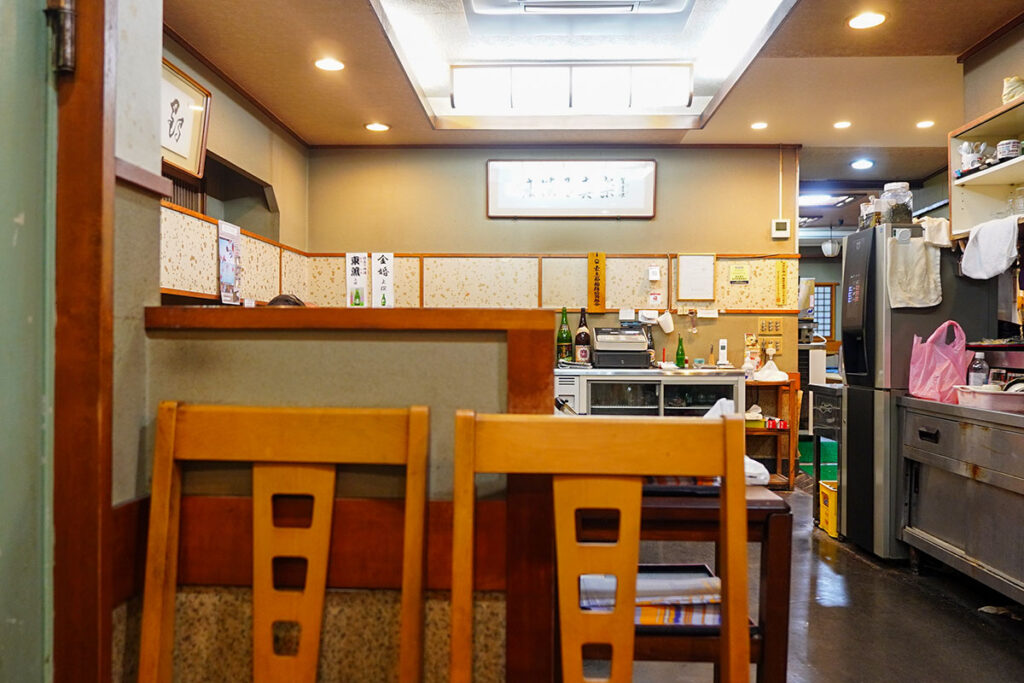 入口こそシンプルでこぶりなのですが、一歩足を踏み入れればその奥行きに驚かされるはず。手前にはテーブル席が並び、奥にはゆったりとした小上がりの座敷が広がっています。外観からは想像できない広さです。