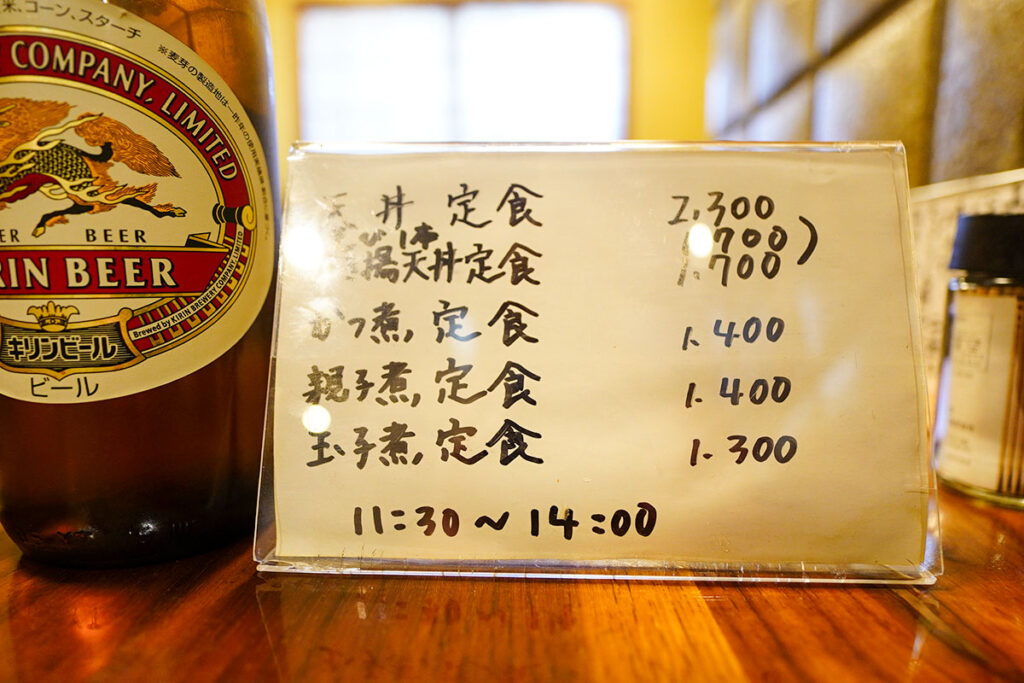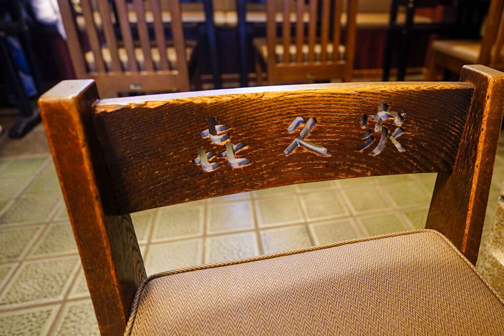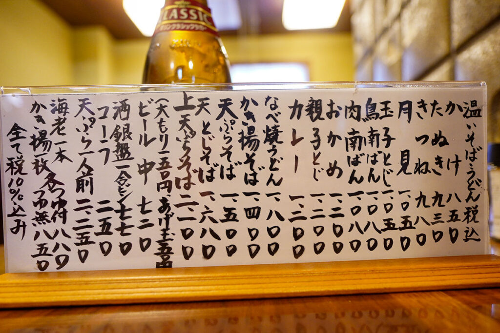 昭和の面影を残す大衆食堂の風景のなか、席に案内されて一息つきます。背もたれに店名が入った椅子など、子供の頃、家族と食べに行った町のお蕎麦屋さんを思い出します。