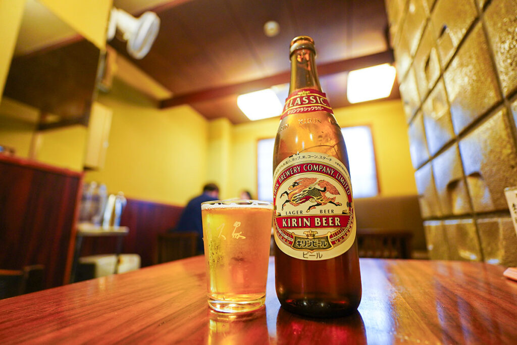 まずはキリンクラシックラガーの中瓶をもらって乾杯。よく冷えた麦酒が喉を潤します。